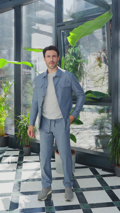 Un informal suit reinterpretat în stil contemporan, alcătuit dintr-o Utility Jacket cu design minimalist și două buzunare decorative la piept și o pereche de pantaloni tip drawstring, pentru un confort rafinat.
