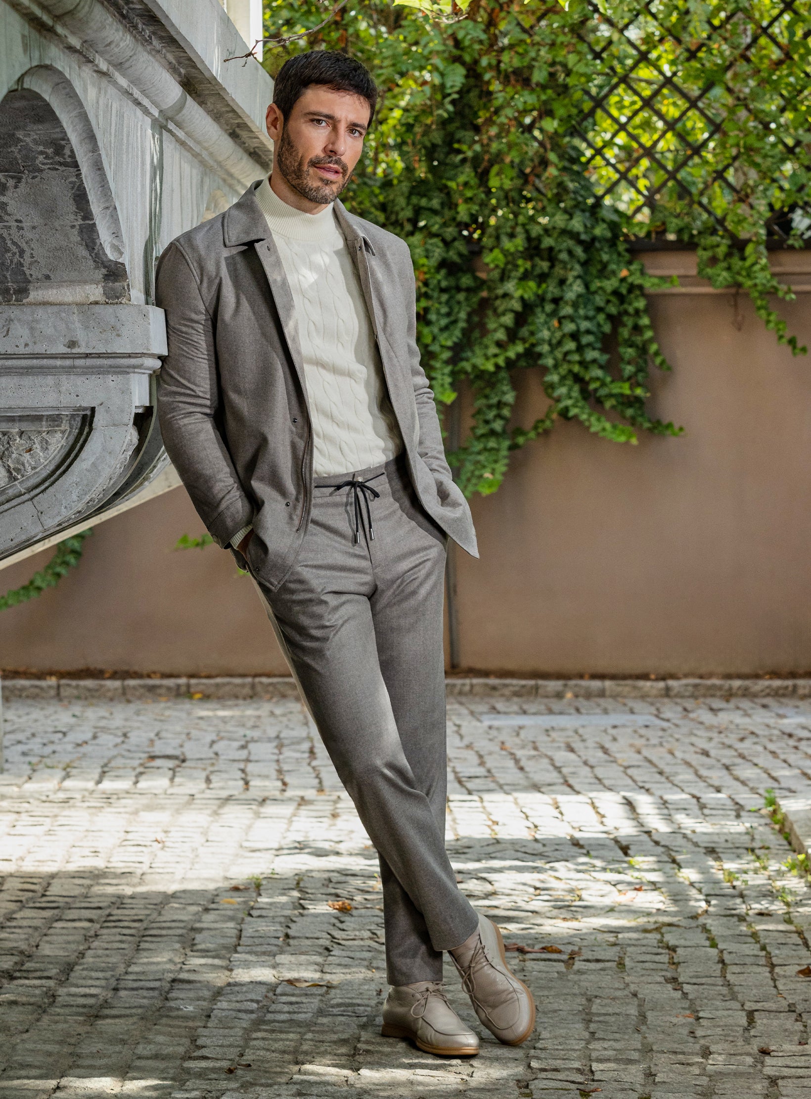 Confecționat din lână flannel de cea mai înaltă calitate, acest costum aduce o nouă dimensiune stilului informal, fiind perfect pentru bărbatul modern care apreciază ținutele relaxate, dar stilate. Pantalonii costumului se disting prin închiderea lor inovatoare tip drawstring, oferind o potrivire excelentă și un confort de neegalat. Această abordare neconvențională adaugă un aer de nonșalanță sofisticată, făcând acest costum ideal pentru o varietate de contexte, de la întâlniri neformale la evenimente smart-casual.