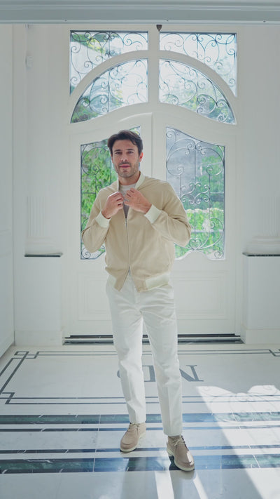 Un bomber jacket care întruchipează esența Quiet Luxury: linii simple, materiale de excepție și o estetică atemporală. Conceput pentru a oferi versatilitate, poate fi purtat atât într-un context urban sofisticat, cât și într-o apariție casual cu accente rafinate.