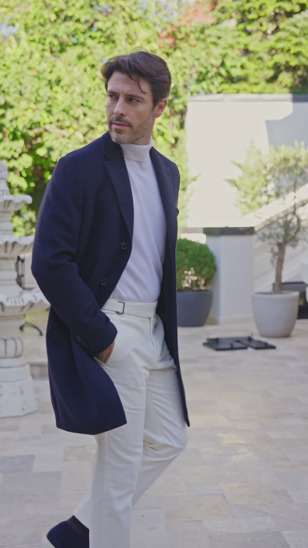 Outfitul este completat de o maletă din lână extra fină, pantaloni chinos în tonuri deschise și pantofi mid top city loafers – o combinație ce exprimă echilibrul perfect între simplitate, rafinament și versatilitate urbană.