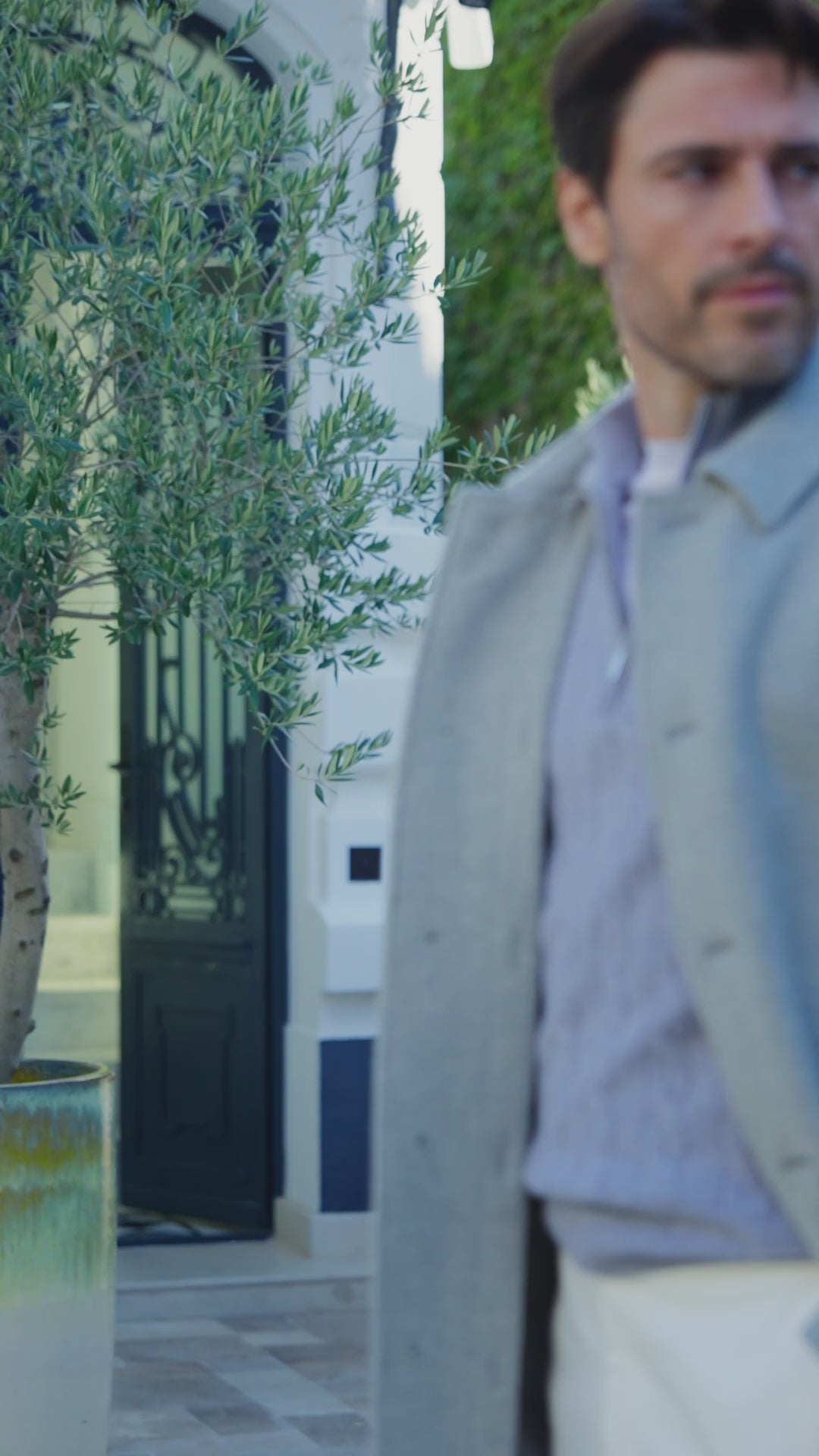 Ținuta este completată de un pulover knit half zip din lână și cașmir, ce adaugă textură și confort, alături de pantalonii tip chinos, creați pentru eleganță relaxată și rafinament cotidian. Look-ul este finalizat de sneakers tip runners, care echilibrează luxul discret cu spiritul urban contemporan.