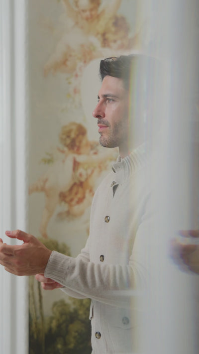 Un outfit construit pe echilibrul perfect dintre lux și naturalețe. Quilted Vest realizată din țesătură exclusivistă Loro Piana aduce profunzime și structură, purtată peste un knit bomber din lână și cașmir, rafinat și versatil. Sub acest ansamblu, o maletă din lână merinos extra fină adaugă delicatețe, în timp ce pantalonii chinos mențin linia impecabilă a unei eleganțe relaxate.