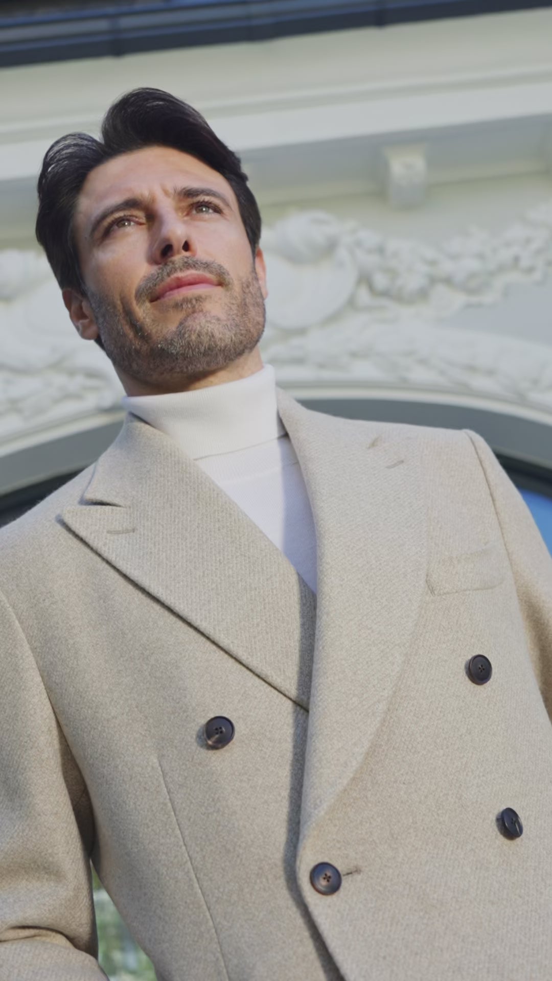 Un palton double breasted realizat din țesătură prețioasă DRAGO Biella, un mix rafinat de lână și cașmir, ce emană eleganță atemporală și discreție sofisticată. Ținuta este completată de o maletă fină din lână merinos extra fină Ermenegildo Zegna, care adaugă un strat de delicatețe și confort, și de pantalonii tip chinos, versatili, eleganți și impecabil croiți pentru un stil relaxat, dar sofisticat.