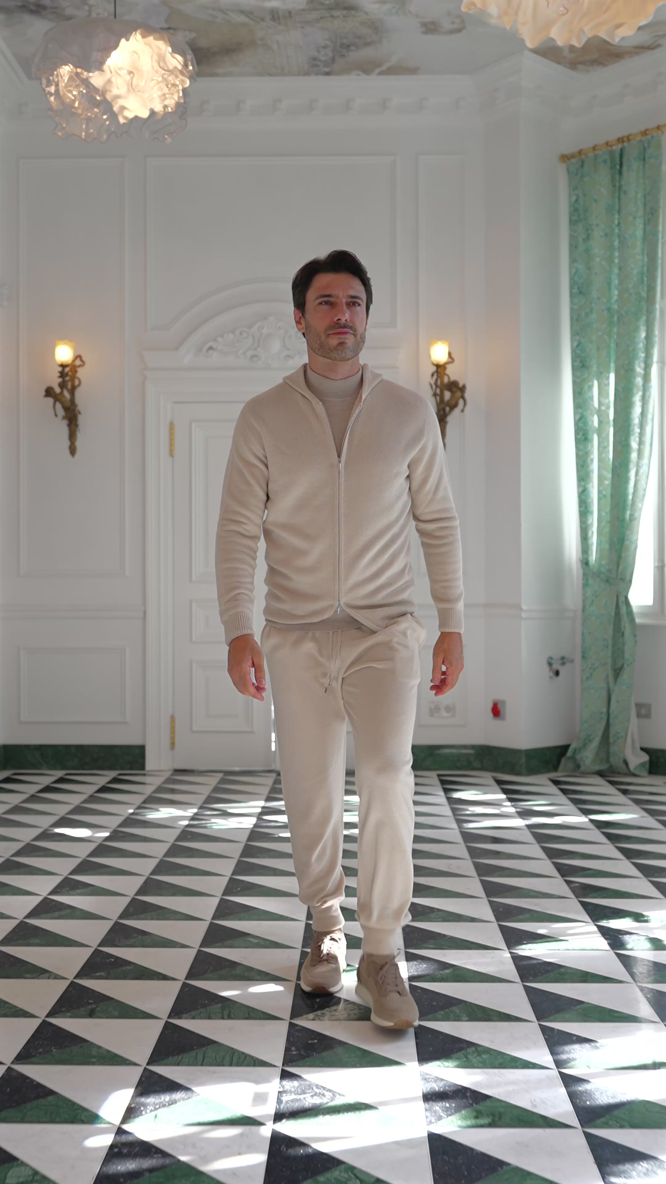 Un outfit leisurewear alcătuit din hoodie și pantaloni realizați integral din cașmir 100%, simbol al confortului suprem și al luxului discret. Textura catifelată a cașmirului redefinește ideea de relaxare, transformând momentele de repaus într-o experiență exclusivistă.