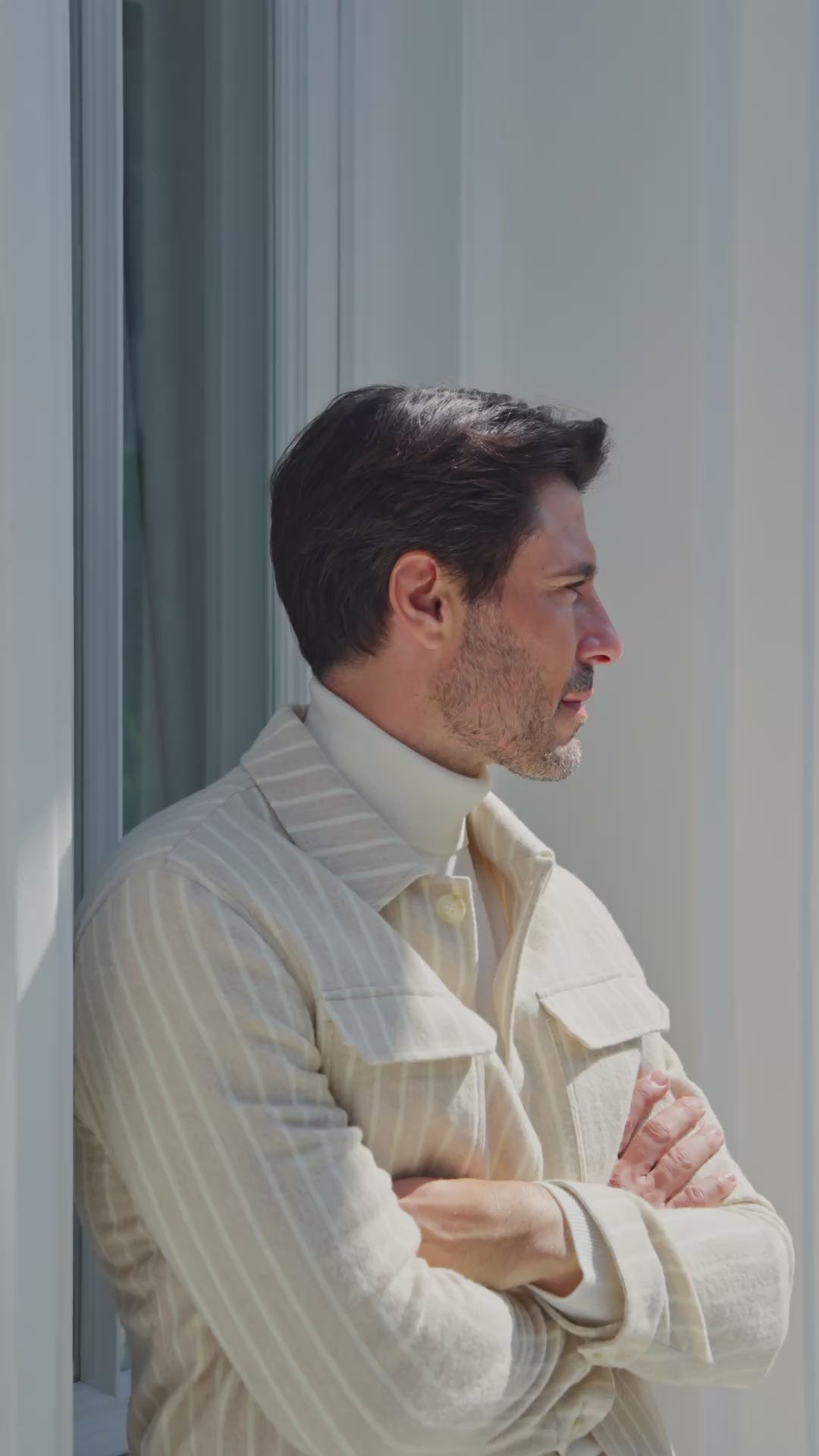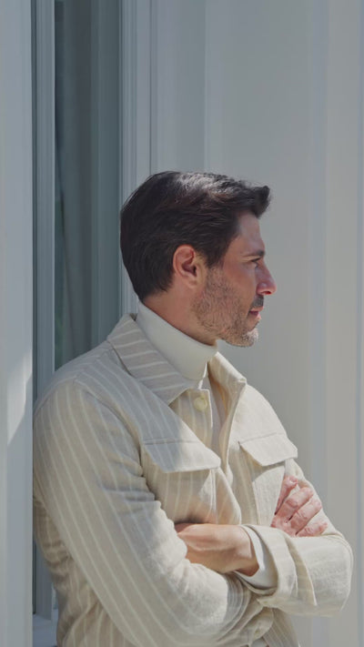 O Utility Jacket realizată din țesătură prețioasă Ferla, cu textură unică și un joc discret de nuanțe, ce conferă eleganță naturală și rafinament atemporal. Layering-ul este completat de un knit fin, care adaugă profunzime și confort, alături de pantalonii tip chinos, versatili și impecabil croiți pentru un stil modern.